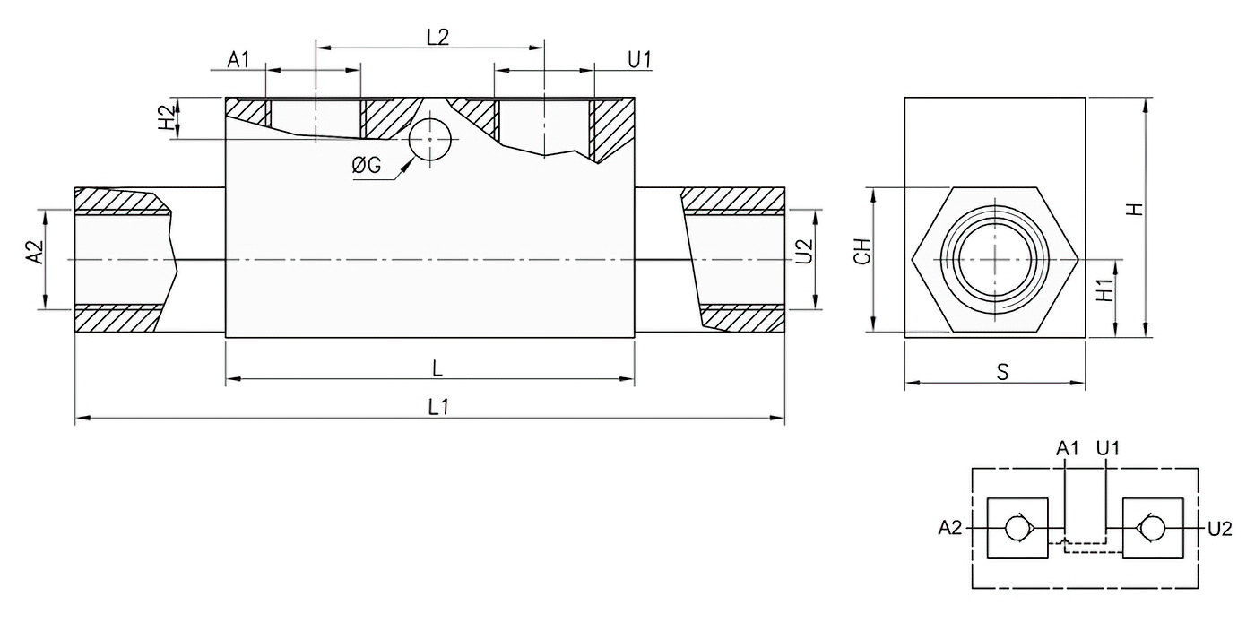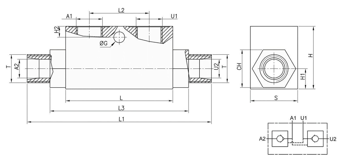 | Type | A1-U1 BSP | A2 - U2 | T | Q MAX L/min | P MAX bar | PILOT RATIO | L MAX | L1 | L2 | L3 | Ø G | H2 | CH | H1 | H | S | Kg |