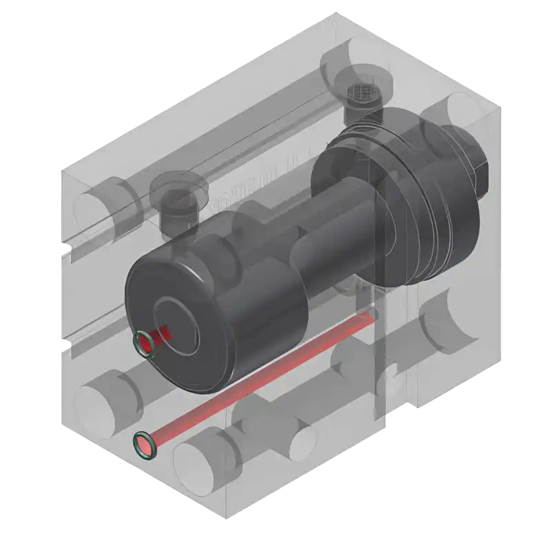 - Alimentazione tramite canalizzazioni ricavate sul corpo macchina che trasmettono il fluido in pressione al cilindro.