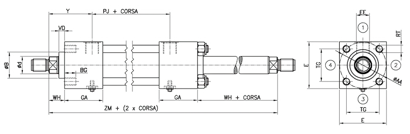 - Serie CD: cilindro oleodinamico a tiranti non magnetico da Ø25 a Ø100;